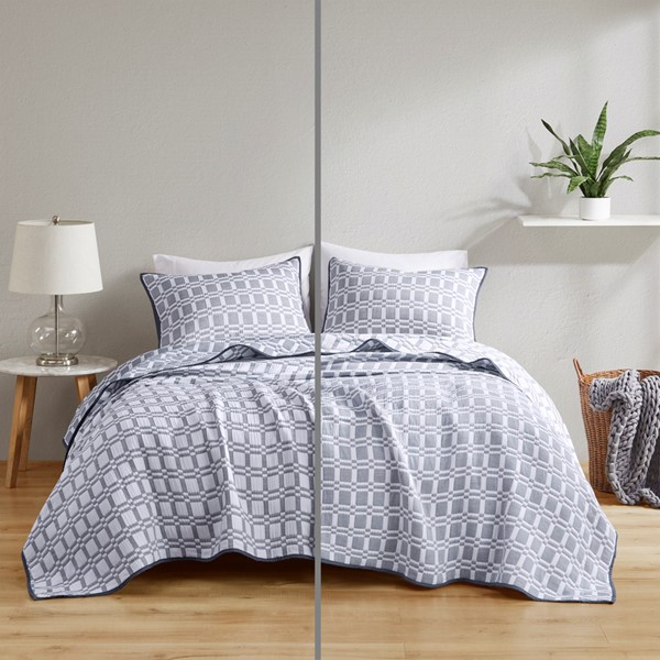 This beautiful bedding set includes a light weight matelasse coverlet and two matching shams. Featuring a modern check design, this fully reversible bedding set allows you to switch between two color schemes of the same design. Available in two options: soft white with smokey grey or soft white with indigo blue. This coverlet bed is machine washable for easy care.