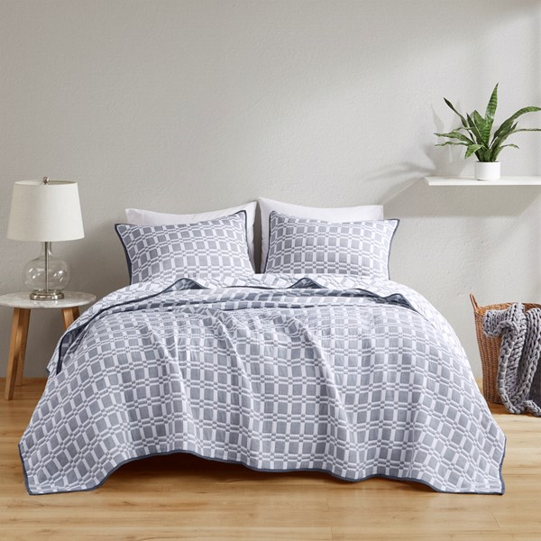 This beautiful bedding set includes a light weight matelasse coverlet and two matching shams. Featuring a modern check design, this fully reversible bedding set allows you to switch between two color schemes of the same design. Available in two options: soft white with smokey grey or soft white with indigo blue. This coverlet bed is machine washable for easy care.