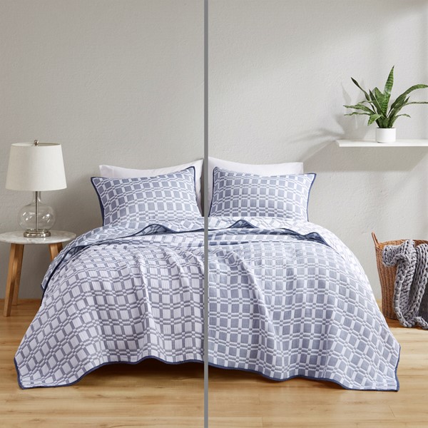 This beautiful bedding set includes a light weight matelasse coverlet and two matching shams. Featuring a modern check design, this fully reversible bedding set allows you to switch between two color schemes of the same design. Available in two options: soft white with smokey grey or soft white with indigo blue. This coverlet bed is machine washable for easy care.