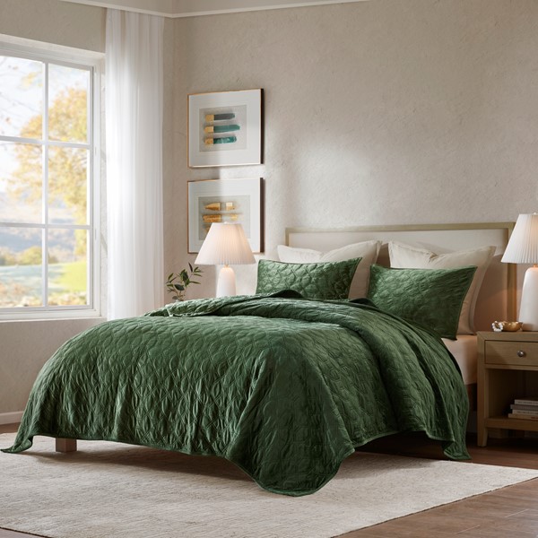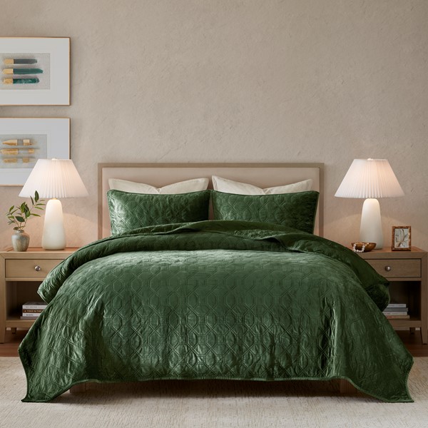 The Madison Park Harper Velvet 3 Piece Quilt Set offers a casual and comfortable update to your bedroom. The polyester velvet quilt features a soft texture with a geometric quilted design, for a rich look and feel. Matching shams pair beautifully with the quilt to complete the quilt set. Providing a charming layering piece to your bed, this quilt has an antimicrobial treatment that helps reduce bacteria buildup and odors, keeping the fabric fresh longer.