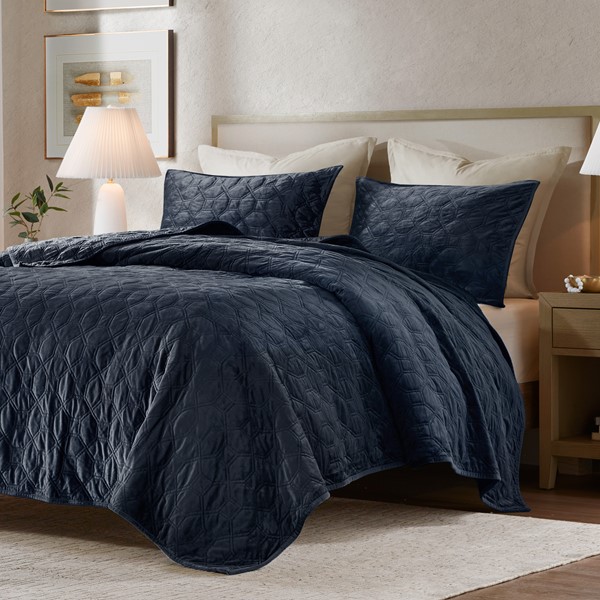 The Madison Park Harper Velvet 3 Piece Quilt Set offers a casual and comfortable update to your bedroom. The polyester velvet quilt features a soft texture with a geometric quilted design, for a rich look and feel. Matching shams pair beautifully with the quilt to complete the quilt set. Providing a charming layering piece to your bed, this quilt has an antimicrobial treatment that helps reduce bacteria buildup and odors, keeping the fabric fresh longer.