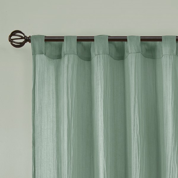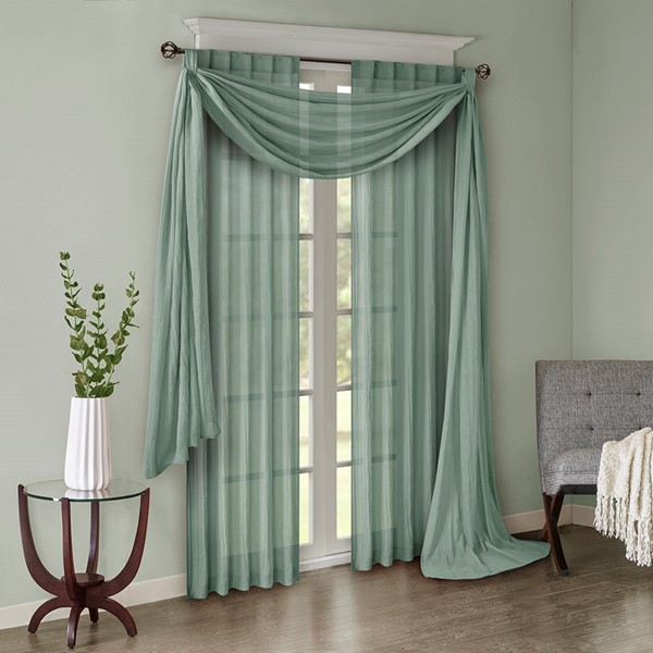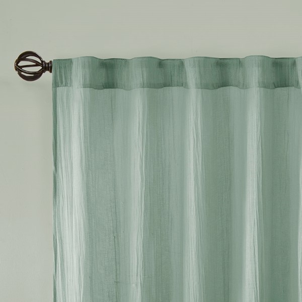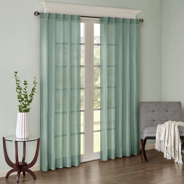 Add a fresh contemporary style to your home with Madison Park’s Harper Solid Crushed Window Panel Pair. Made from a lightweight aqua sheer fabric, this window panel pair is easy to drape and softly filters the perfect amount of light into your room. Crushed detailing on each panel provides a beautiful texture, adding a touch of modern elegance. Simply hang this sheer panel pair with the rod pocket top or use the back tabs for a more tailored finish to your decor; fits up to 1.25" diameter rod. For a complete look, layer this panel pair with coordinating scarf or prints within the collection for a more custom appeal.