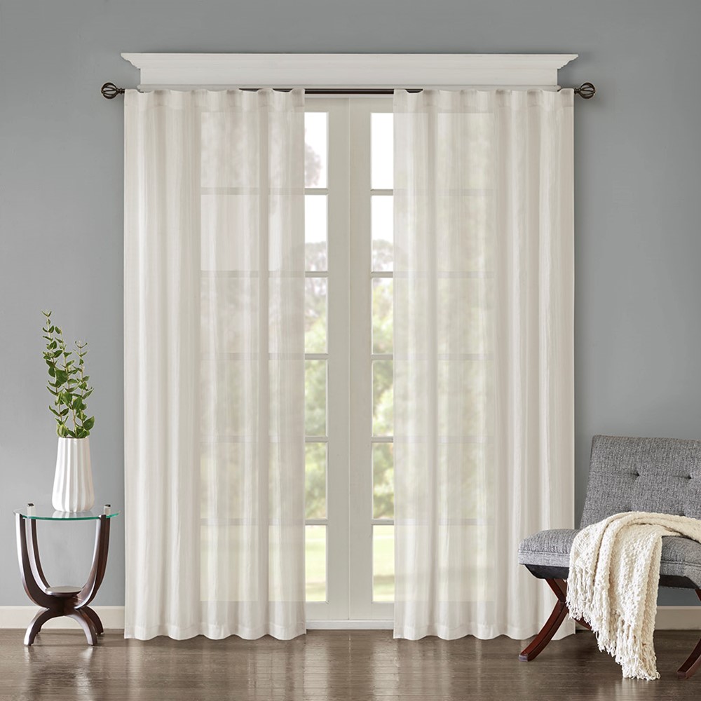 Add a fresh contemporary style to your home with Madison Park’s Harper Solid Crushed Window Panel Pair. Made from a lightweight white sheer fabric, this window panel pair is easy to drape and softly filters the perfect amount of light into your room. Crushed detailing on each panel provides a beautiful texture, adding a touch of modern elegance. Simply hang this sheer panel pair with the rod pocket top or use the back tabs for a more tailored finish to your decor; fits up to 1.25″ diameter rod. For a complete look, layer this panel pair with coordinating scarf or prints within the collection for a more custom appeal.