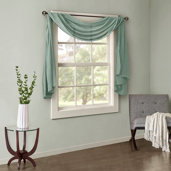 Soften the edges of your window, with our Madison Park Harper Solid Crushed Sheer Scarf. This dusty aqua scarf features crushed detailing for beautiful texture, while the lightweight sheer fabric provides easy draping and an airy touch to your decor. Four tabs are also included to make the DIY assembly easy so you can drape the scarf to best fit your window. For a complete look, layer this scarf with coordinating panels or prints in our collection for a more custom appeal.