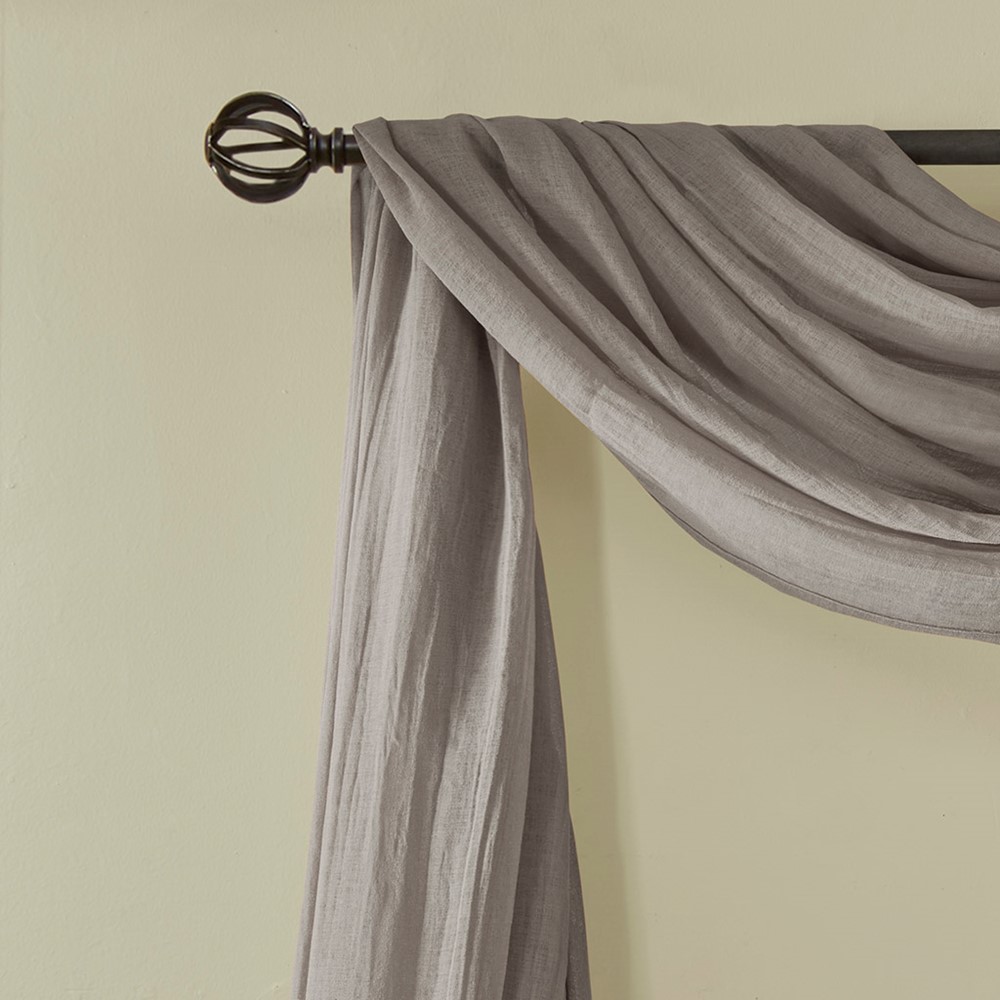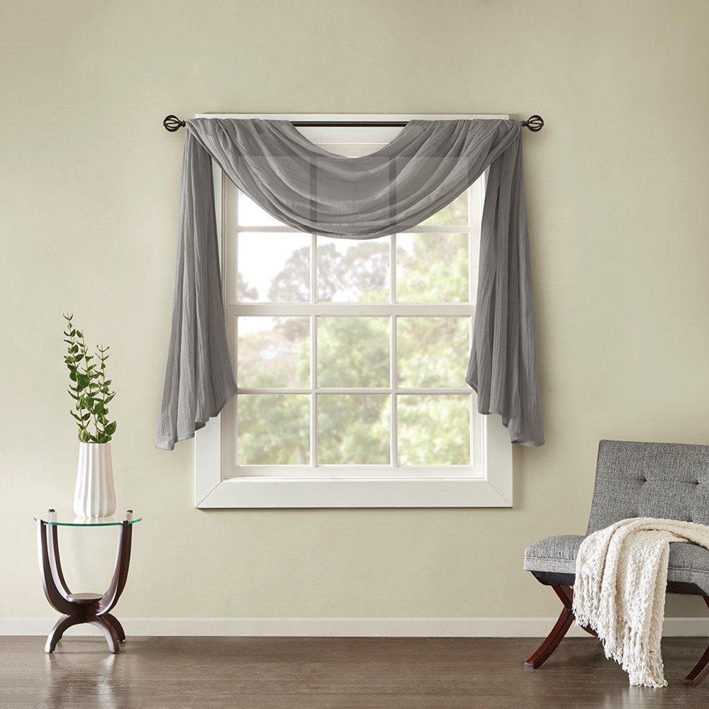 Soften the edges of your window, with our Madison Park Harper Solid Crushed Sheer Scarf. This light grey scarf features crushed detailing for beautiful texture, while the lightweight sheer fabric provides easy draping and an airy touch to your decor. Four tabs are also included to make the DIY assembly easy so you can drape the scarf to best fit your window. For a complete look, layer this scarf with coordinating panels or prints in our collection for a more custom appeal.