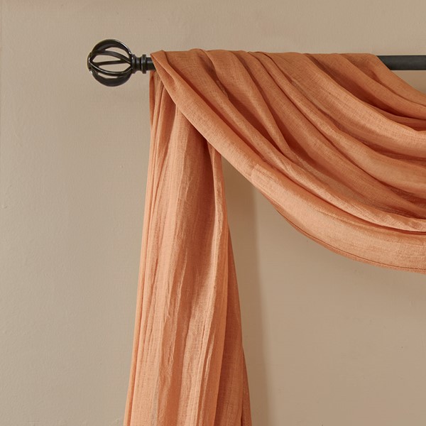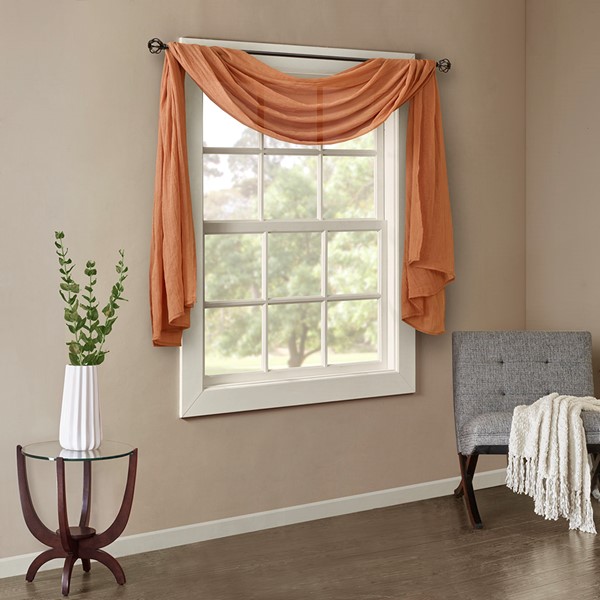Soften the edges of your window, with our Madison Park Harper Solid Crushed Sheer Scarf. This light spice scarf features crushed detailing for beautiful texture, while the lightweight sheer fabric provides easy draping and an airy touch to your decor. Four tabs are also included to make the DIY assembly easy so you can drape the scarf to best fit your window. For a complete look, layer this scarf with coordinating panels or prints in our collection for a more custom appeal.