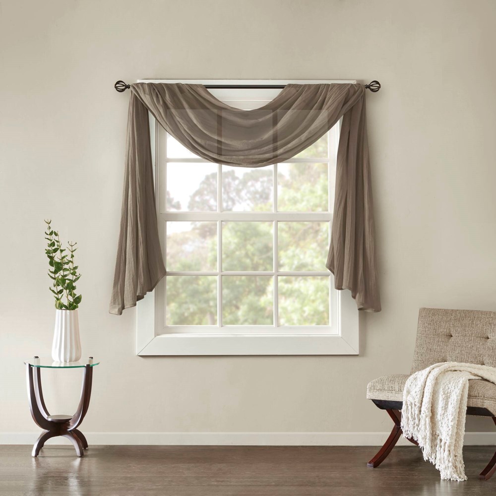 Soften the edges of your window, with our Madison Park Harper Solid Crushed Sheer Scarf. This light taupe scarf features crushed detailing for beautiful texture, while the lightweight sheer fabric provides easy draping and an airy touch to your decor. Four tabs are also included to make the DIY assembly easy so you can drape the scarf to best fit your window. For a complete look, layer this scarf with coordinating panels or prints in our collection for a more custom appeal.