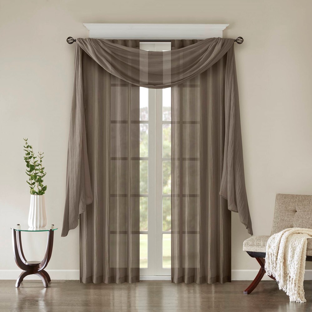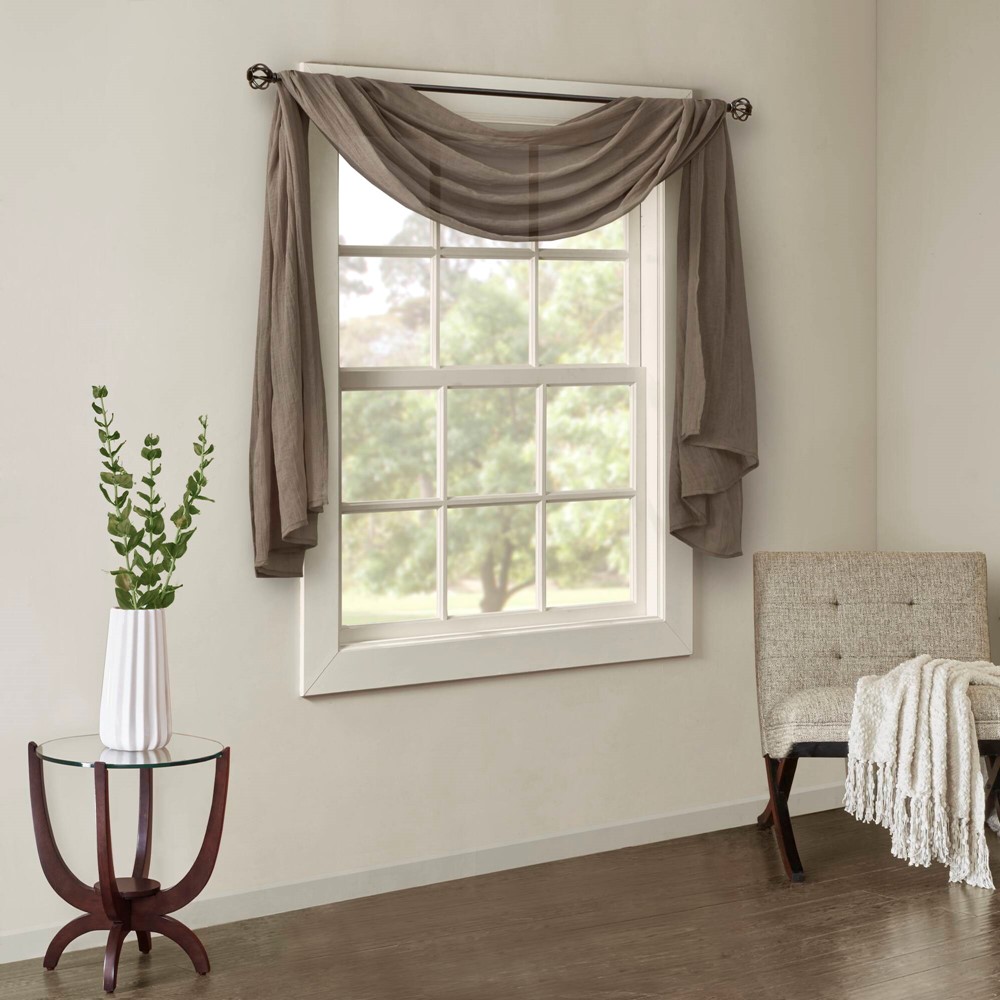 Soften the edges of your window, with our Madison Park Harper Solid Crushed Sheer Scarf. This light taupe scarf features crushed detailing for beautiful texture, while the lightweight sheer fabric provides easy draping and an airy touch to your decor. Four tabs are also included to make the DIY assembly easy so you can drape the scarf to best fit your window. For a complete look, layer this scarf with coordinating panels or prints in our collection for a more custom appeal.