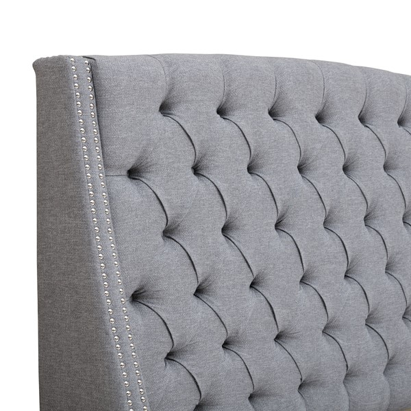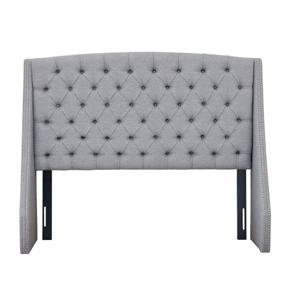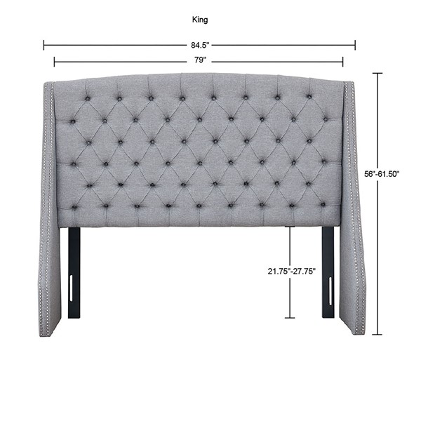 Create an aura of stately elegance in your bedroom with is upholstered headboard. Inspired by elegant luxury, this king size showcases rich button tufts and a polished silver nail head trim. A wood frame and metal legs in a black finish provide exceptional support and sturdiness. The lavish grey color of this upholstered headboard offers a stylish update for any bedroom decor. Assembly is required. Hardware (pack B) included to attach headboard to standard bed frame.
