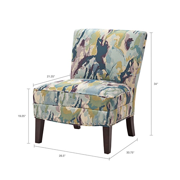 The Madison Park Hayden Slipper Accent Chair offers the perfect marriage of comfort and style to update your home decor. This upholstered slipper chair flaunts an armless design and an elegant back to create a gorgeous silhouette. The vivid upholstery is complemented by the rich finish on the solid wood legs, while a silver nail head trim around the bottom edge adds a refined touch. Constructed with high-density foam for maximum comfort, this slipper accent chair brings a stunning modern addition to your living room or bedroom. Assembly required.