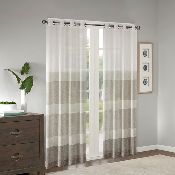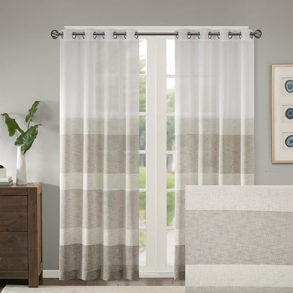 Modern stripes at its best, our Madison Park Hayden Woven Window Panel is the perfect addition for a relaxed space. Neutral tonal stripes are printed at the bottom for a unique border design, while the faux linen sheer fabric provides an organic texture for a cool and casual update. Silver grommet top makes this panel easy to hang, open, and close throughout the day; fits up to 1.25" diameter rod.