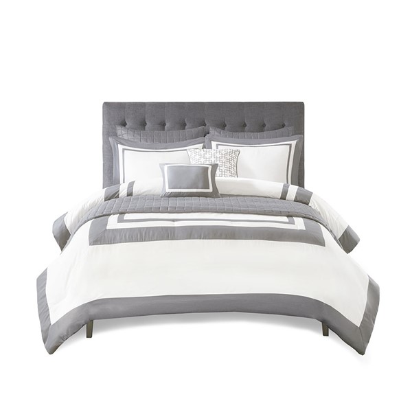 This Heritage hotel bedding collection includes a comforter and quilt that both come with matching shams to complete a luxurious layered look. The soft comforter and shams showcase a bold border on a white ground with a solid white reverse, while the lightweight quilt and its shams display a window pane end-to-end quilting pattern. Two decorative pillows, one square and one oblong with embroidered and pieced details provide the perfect finishing touches to this 8 piece bedding set. This set is available in grey, navy, and taupe options. Machine washable for easy care, this collection is great for year-round use.