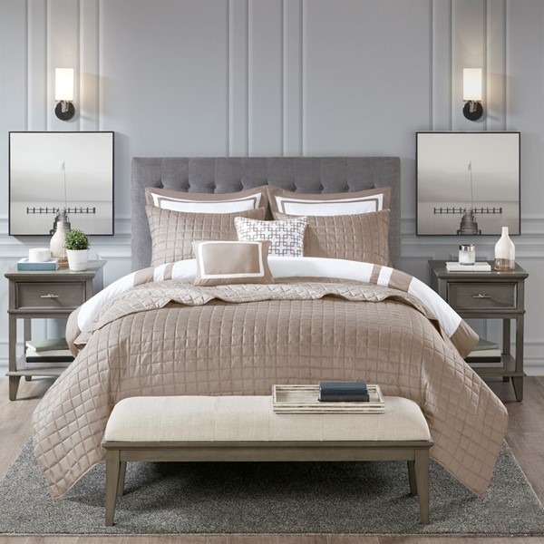 This Heritage hotel bedding collection includes a comforter and quilt that both come with matching shams to complete a luxurious layered look. The soft comforter and shams showcase a bold border on a white ground with a solid white reverse, while the lightweight quilt and its shams display a window pane end-to-end quilting pattern. Two decorative pillows, one square and one oblong with embroidered and pieced details provide the perfect finishing touches to this 8 piece bedding set. This set is available in grey, navy, and taupe options. Machine washable for easy care, this collection is great for year-round use.