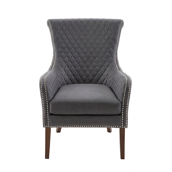 Relax in the luxurious style of the Madison Park Accent Chair. This modern accent chair takes on a classic twist with a quilted back and elegant silver studs lining the arms and seat. A high-density foam cushion fills the seat for exceptional comfort, while solid wood legs with a Morocco finish provide excellent support. Perfect in the living room or home office, this accent chair add elegance to your home decor. Leg assembly is required.