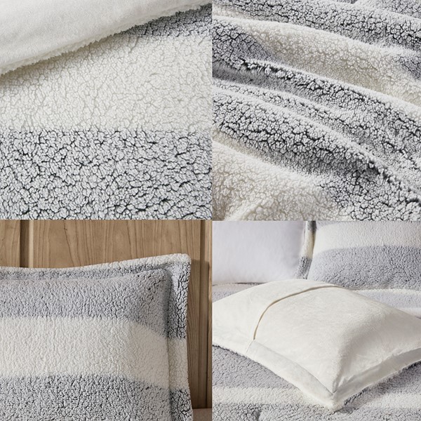 This modern and cozy comforter set gives your bedroom a rustic feel with its farmhouse-style design and striped sherpa material. Complete with a comforter and 2 shams, this set will shift either grey in cool lighting or green in warm lighting to complement the natural tones of your room. The ultra-soft material is Oeko-Tex certified, ensuring quality comfort and wellness, and the set is machine washable for added convenience.