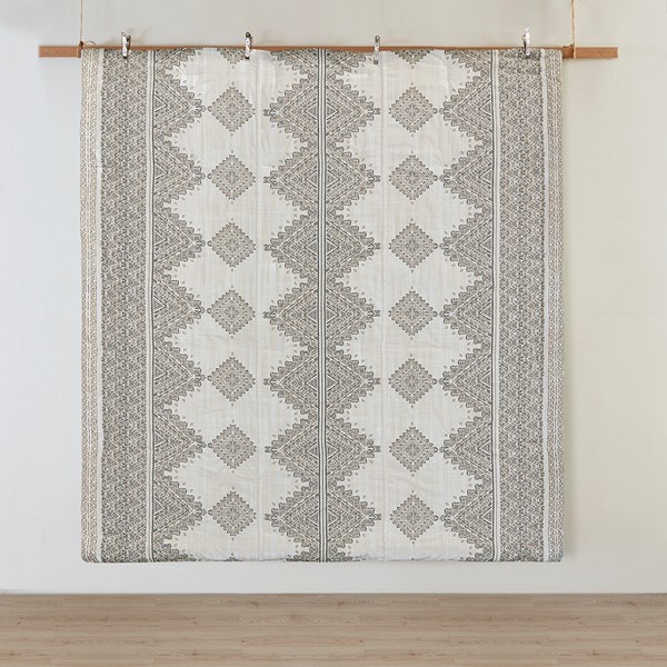 This soft microfiber artisan comforter set displays a printed global inspired design, perfect for chic boho bedroom. Featuring small triangular shapes and lines that when formed together depicts larger geometric shapes and stripes on top of a beige and ivory background. Two white chenille trim at the center of the bed adds dimension to the set while the dark throw pillow adds contrasts. Colors featured in this set include various shade black, brown, tan, and grey. The comforter and pillows are filled with hypoallergenic polyester filling that is treated to be dustproof, ensuring a restful and comfortable sleeping experience. This bedding set is also OEKO-TEX certified and machine washable for easy care.