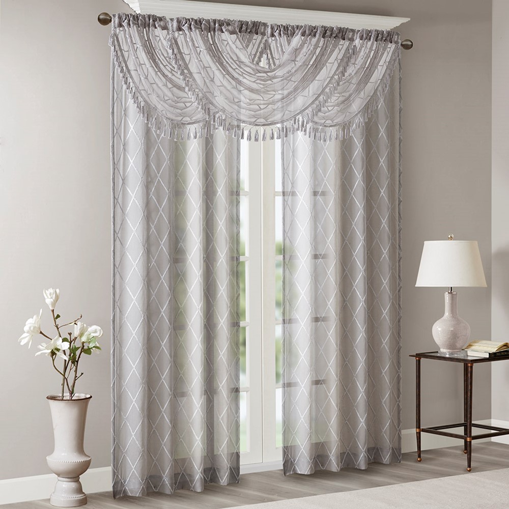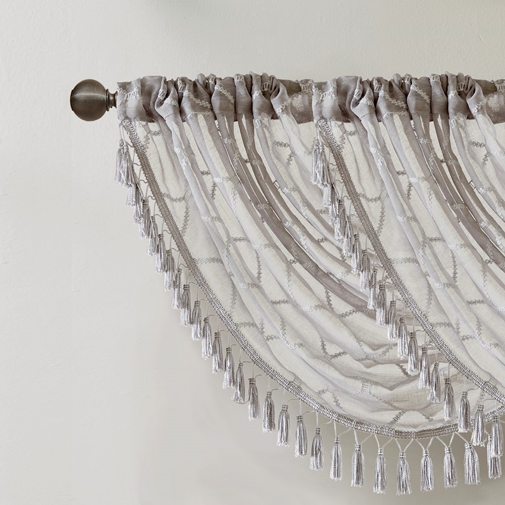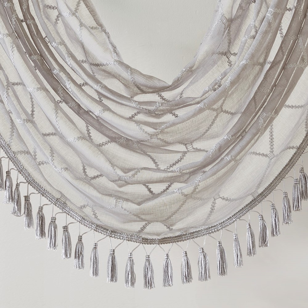 Madison Park’s Irina Diamond Sheer Waterfall Valance provides an alluring update to your home. An elegant diamond pattern is beautifully embroidered on a soft sheer fabric, adding grace and charm to your decor. The neutral colors and light fabric helps create a delicate look to soften any room, combined with the beautiful tassel trim and rich draping details, makes this the perfect dressing to any window. Complete the look with coordinating window panels, sold separately. Multiple valances used to create this look.