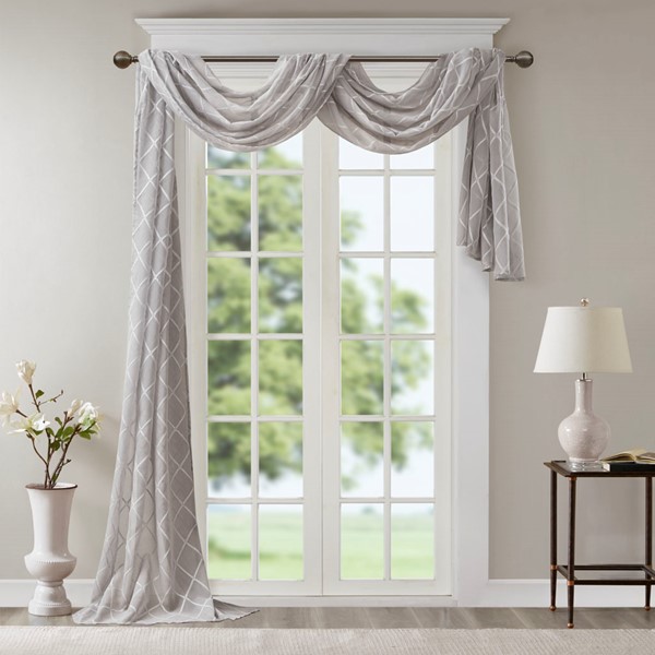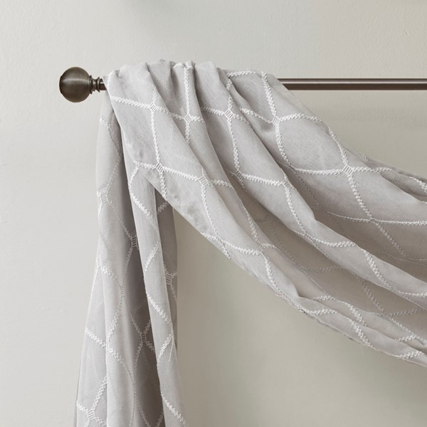 Madison Park’s Irina Diamond Sheer Window Scarf provides an alluring update to your home. An elegant diamond pattern is beautifully embroidered on a soft sheer fabric, adding grace and charm to your decor. The neutral colors and light fabric helps create a delicate look to soften any room. Perfect on it’s own as a beautiful drape to frame any window, or complete the look with coordinating window panels, sold separately.