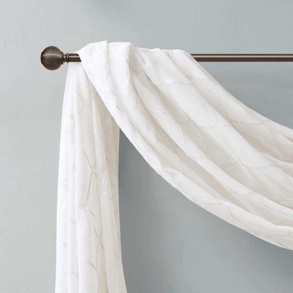 Madison Park’s Irina Diamond Sheer Window Scarf provides an alluring update to your home. An elegant diamond pattern is beautifully embroidered on a soft sheer fabric, adding grace and charm to your decor. The neutral colors and light fabric helps create a delicate look to soften any room. Perfect on it’s own as a beautiful drape to frame any window, or complete the look with coordinating window panels, sold separately.
