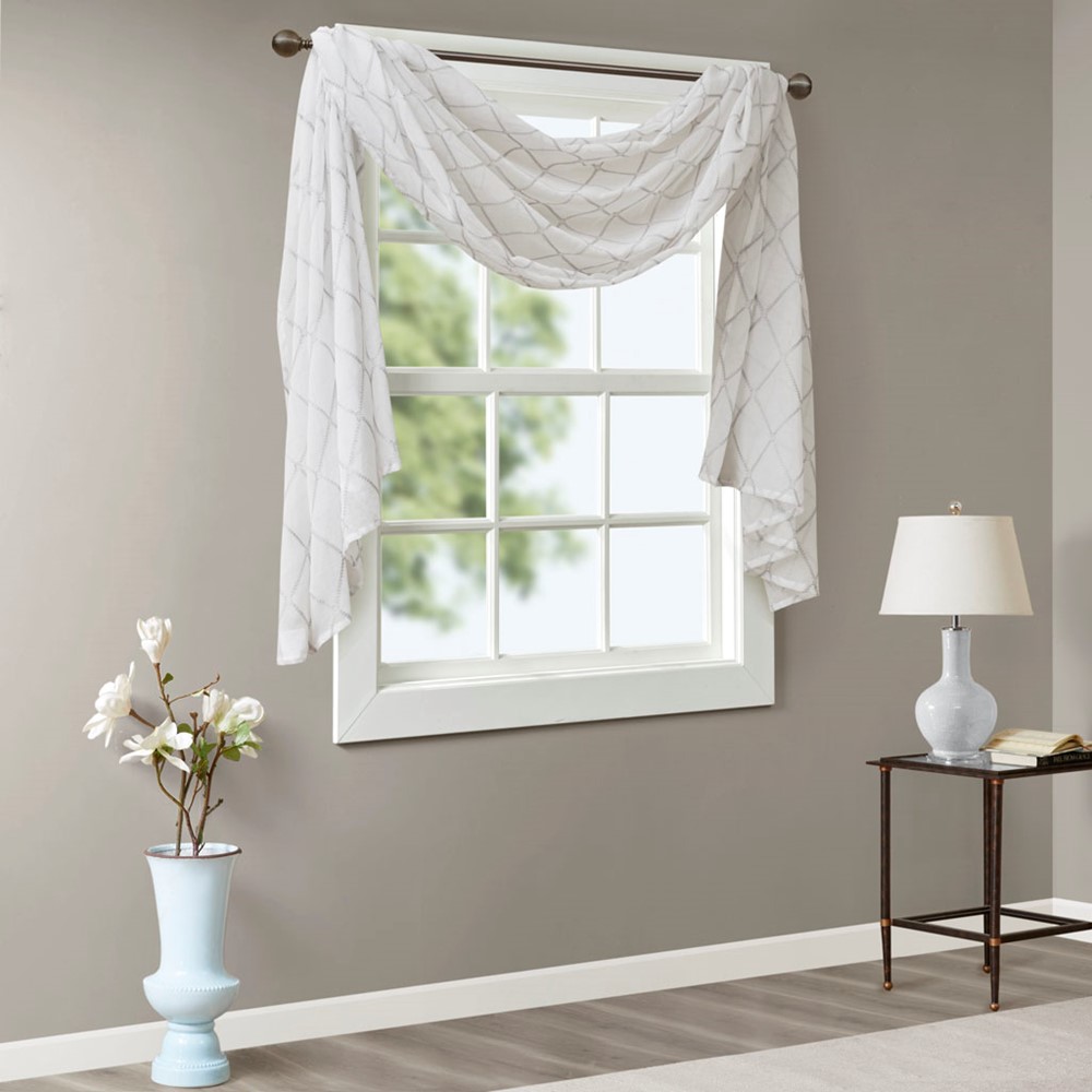 Madison Park’s Irina Diamond Sheer Window Scarf provides an alluring update to your home. An elegant diamond pattern is beautifully embroidered on a soft sheer fabric, adding grace and charm to your decor. The neutral colors and light fabric helps create a delicate look to soften any room. Perfect on it’s own as a beautiful drape to frame any window, or complete the look with coordinating window panels, sold separately.