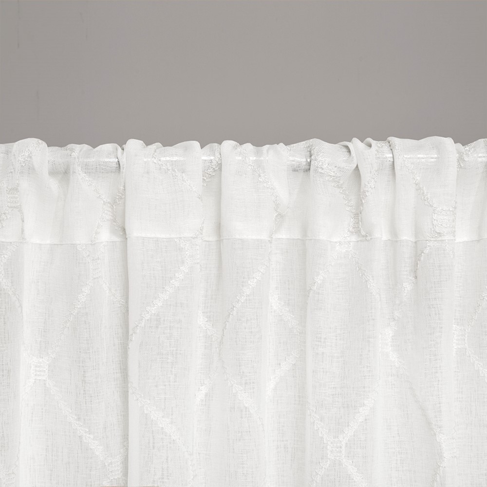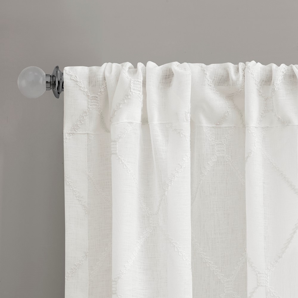 Madison Park’s Irina Diamond Sheer Window Curtain provides an alluring update to your home. An elegant diamond pattern is beautifully embroidered on a soft sheer fabric, adding grace and charm to your decor. The neutral colors and light fabric helps create a delicate look to soften any room. Hang this sheer window curtain using the rod pocket for a simple finish. Fits up to a 1.25″ diameter rod.