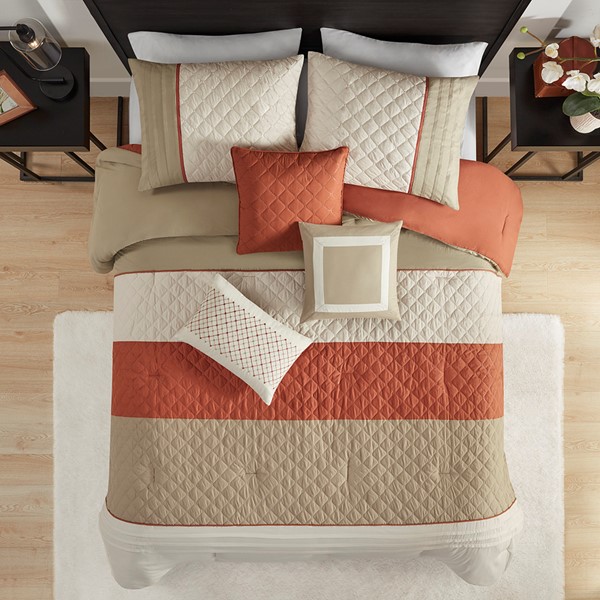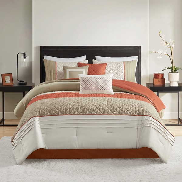 Perfect update to the bedroom, this transitional microfiber comforter set features printed and pinsonic techniques pieced together in a striped colorblock design. The three throw pillows are embellished with embroidery, piecing and more pinsonic techniques. A matching bed skirt is included to complete the look. This bedding set is available in a grey and blue combination or a spice, taupe, oatmeal combination. The comforter and pillows are filled with hypoallergenic polyester filling that is dustproof, ensuring a restful and comfortable sleeping experience. This OEKO-Tex certified bedding set can also be machine washed and is extra durable for long lasting comfort.
