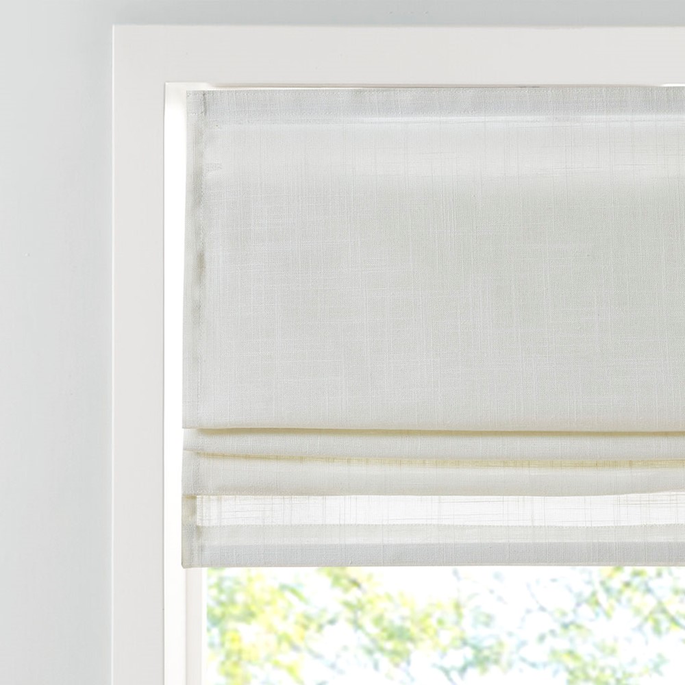 Casual and stylish, the Madison Park Kyler Linen Blend Light Filtering Roman Shade is an easy addition to freshen up any space. This roman shade features a beautifully textured linen blend fabric in a soft white tone creating a natural look and feel, while the lightweight fabric lets the right amount of light into your home for a bright, yet soft and airy touch. The cordless retraction mechanism makes it easy to open and close the window shade throughout the day, while the detachable fabric face allows for easier assembly and cleaning by lightly shaking or dusting. Though detachable from the hook and loop fastener, the top face fabric is NOT fully removable. Ready to install right out of the packaging, this roman shade can be hung inside or above the window pane allowing you to find the perfect fit for your home decor. Each shade is also OEKO-TEX certified, meaning it does not contain any harmful substances or chemicals to ensure quality comfort and wellness. Shade measures 64-inches in length and comes in 5 width options to suit multiple standard window sizes; each roman shade is sold as a single and comes with a printed instructional guide as well as an instructional video available on site. Assembly is required. Complete the look with coordinating window panel pairs, available and sold separately.