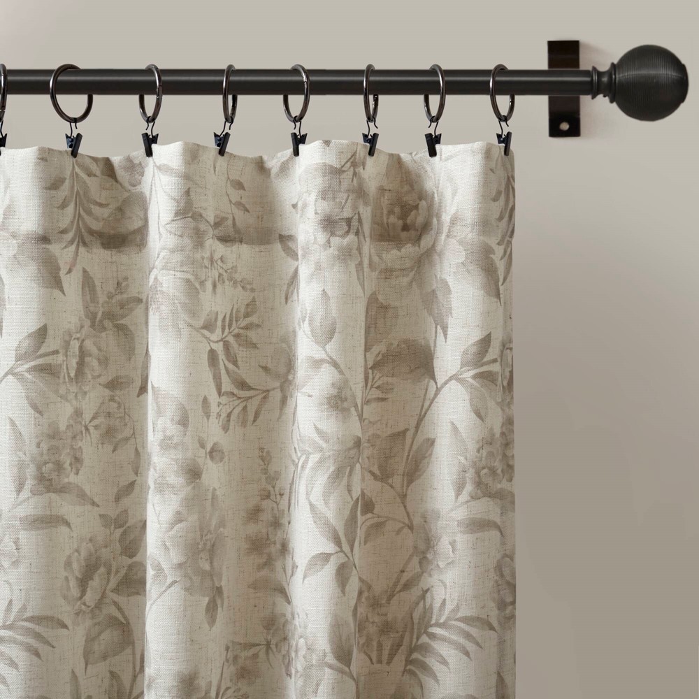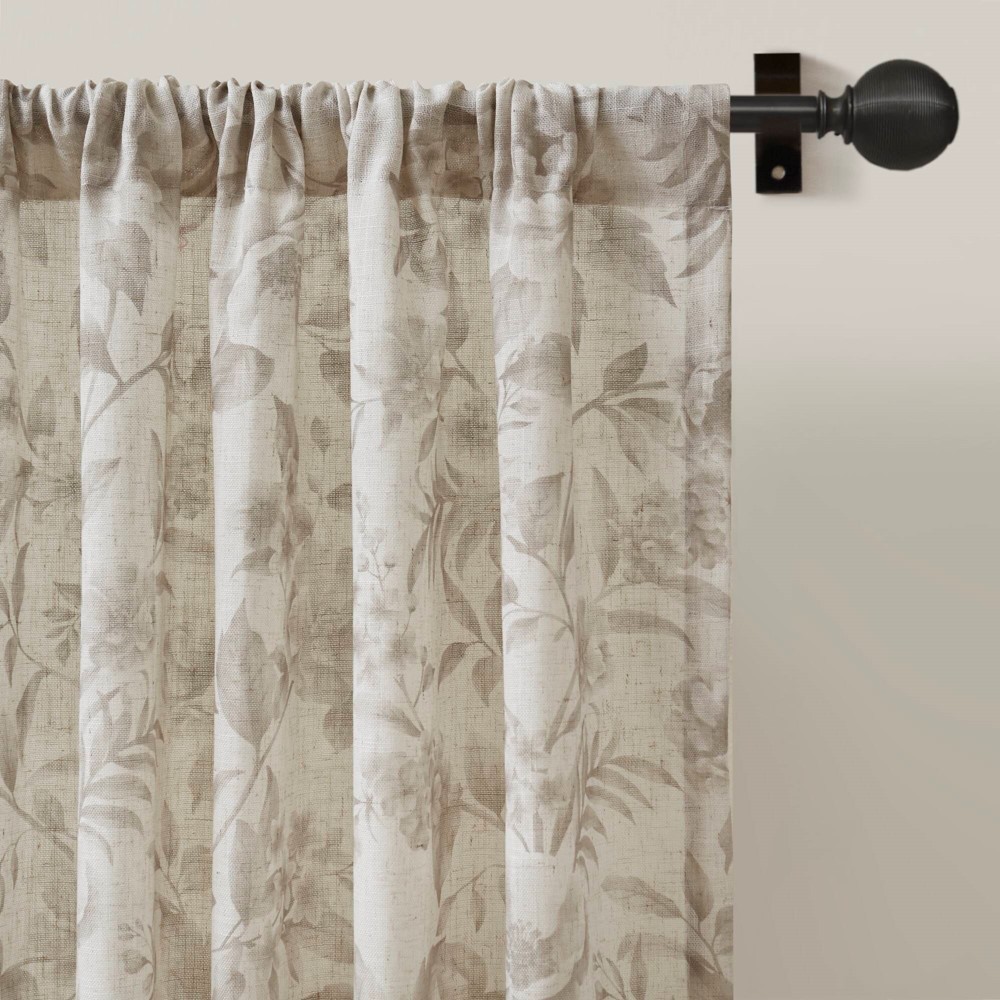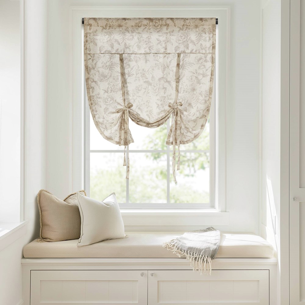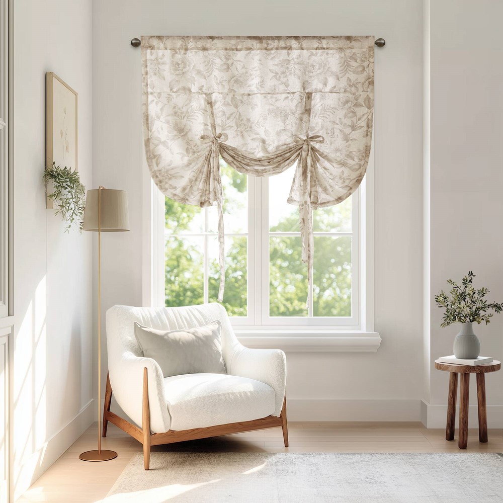 Add a touch of nature and timeless elegance to your windows with this floral printed curtain collection. Both the curtain panel and the tie-up valance feature a soft linen-textured fabric printed with delicate botanical patterns in neutral tones. The light-filtering fabric allows gentle sunlight to pass through while providing privacy–creating a warm and cozy atmosphere in any room.