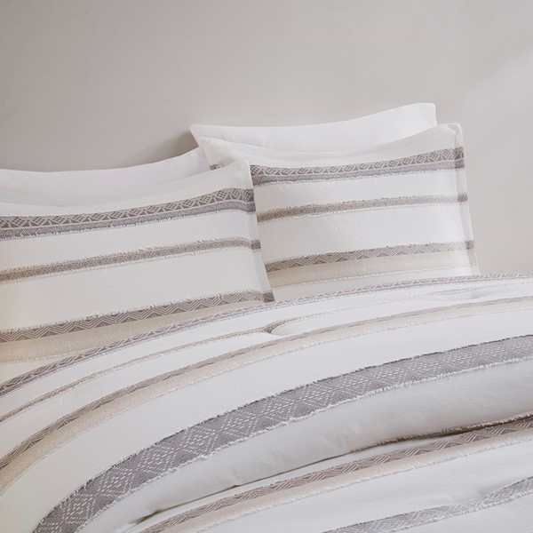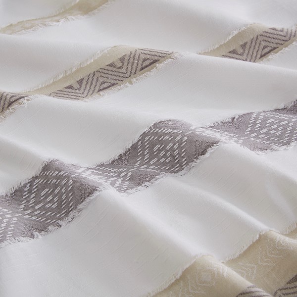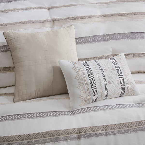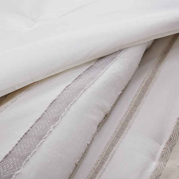 Brighten your bedroom with the refreshing beauty of this globally inspired comforter set. A clipped jacquard stripe design, in taupe, gray, birch, and tan colors, is artistically arranged on the off white fabric, for an understated casual look. Geometric details in the stripes elevate the design of the comforter, while the solid white reverse adds a bright complementary touch to the bed. Along with the beautifully tailored shams, 2 decorative pillows finish off this charming jacquard comforter set.