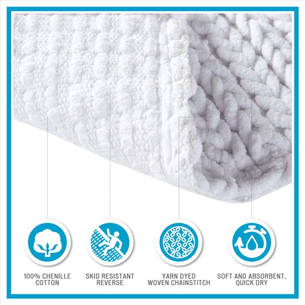 The Madison Park Lasso 100% Cotton Chenille Chain Stitch Rug provides a soft textural update to your bathroom decor. This cotton chenille bath rug features a woven chain stitch design that creates dimension and texture, for a fun and fresh update. Made from 100% piece-dyed cotton chenille each rug is incredibly soft, absorbent, quick dry, and fade resistant; while a non-skid transparent latex reverse helps keep rug in place throughout the day. This bath rug is also OEKO-TEX certified, meaning it does not contain any harmful substances or chemicals to ensure quality comfort and wellness. Machine washable for easy care, this bath rug collection comes in a variety of colors and sizes to suit any bathroom decor and size. Complete the look with the coordinating Madison Park Breeze Bath Towel Set!