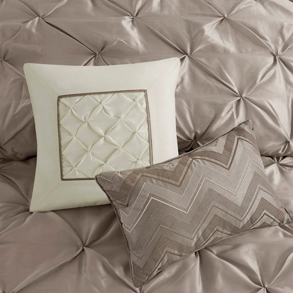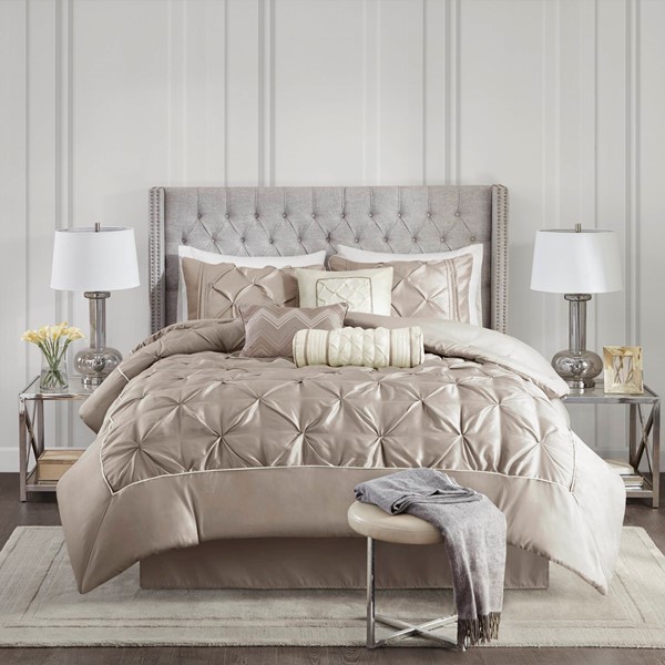 This beautifully tufted bed is from the Laurel bedding collection. Its neutral taupe coloring makes this set easy to accessorize in your bedroom. The collection is made from 100% polyester polyoni and has pieced fabric sewn together to give this set dimension. It is finished with a smooth edge of fabric that creates a beautiful border around this comforter. Items in the set may come in a rolled or compressed packaging, which will need to be fluffed up or steam ironed before use to remove wrinkles.