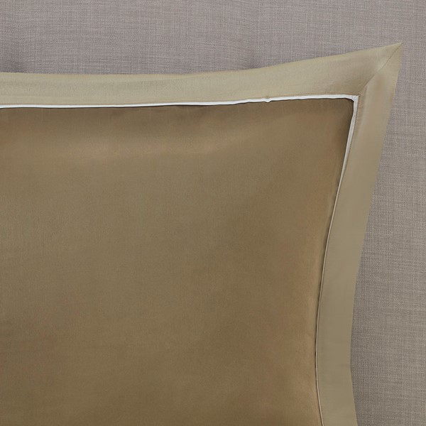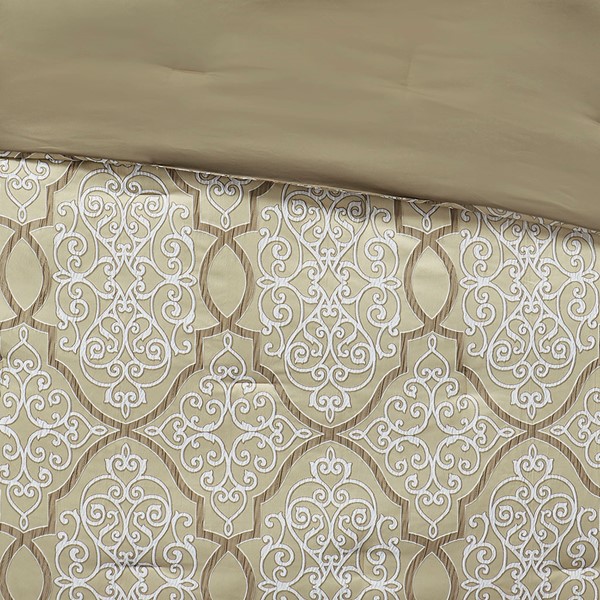 The Madison Park Lavine 12 Piece Bedding Collection gives your bedroom a rich and luxurious makeover. The comforter features a soft gold jacquard woven fabric with a 3D effect created by a damask design in brown and off white. The two pillow shams match the comforter design to enhance the luxury style. Two decorative pillows with embroidery and fabric manipulation details coordinate with the two euro shams for a stunning bedroom look. The set also comes with a complete ivory 100% cotton sheet set that adds a cozy touch to the bedding set. The items in the set may arrive in a rolled or compressed form, so you may need to fluff them up or steam iron them to smooth out any wrinkles.