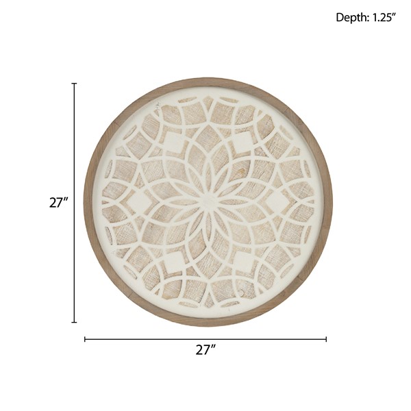 Our Madison Park Leah Round Two-tone Medallion Wall Decor by Artist Emily Warne is the perfect addition for a stylish Boho update to your home. This round wall decor features a molded white washed medallion design on a natural wood color base, for a rustic touch on the beautifully globally inspired look. Measuring 27", featuring 2 D-rings on the reverse to easily hang, and MDF construction for added support makes this medallion wall art simple and light for any wall or space.