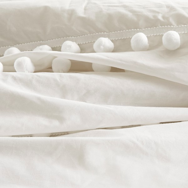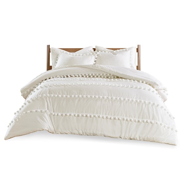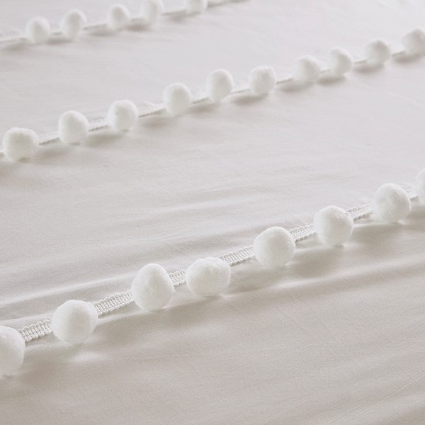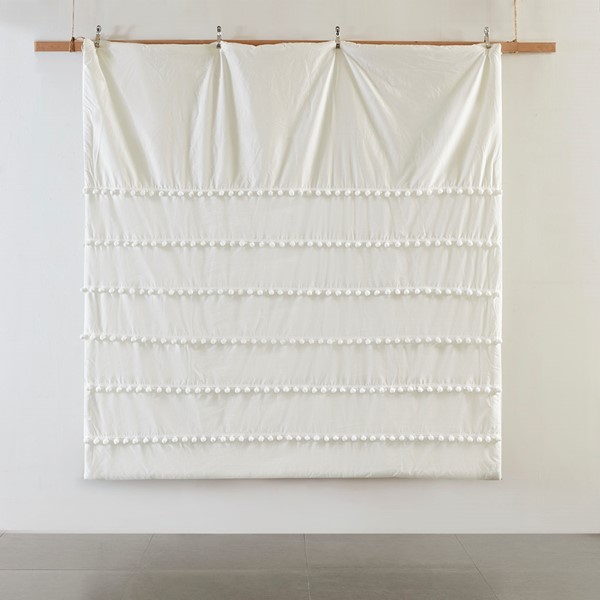 The Madison Park Leona 3 Piece Pom Pom Comforter Set offers a simple chic update to your bedroom decor. Made from 100% cotton, the face of this ivory comforter features stripes of pompoms that add texture and dimension for a boho inspired look. The matching cotton shams flaunts a pompom trim to complement the top of the bed. Hypoallergenic filling in the comforter provides exceptional warmth and comfort. Machine washable for easy care, this pompom comforter set gives your bed a casual yet chic style to turn your bedroom into a relaxing space.