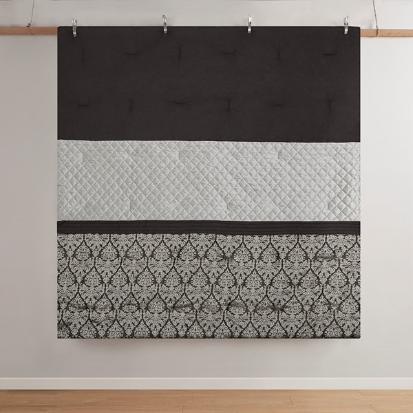 This traditional jacquard comforter set features embroidered mink, subtle pintucks, and an elegant damask design pieced together for a lavish bedroom update. The three throw pillows featuring mink, woven jacquard, and embroidery help complete the set. Available in two options: opulent plum with khaki tan or a rich black with silver grey. The comforter and pillows are filled with hypoallergenic polyester filling that is dustproof, ensuring a restful and comfortable sleeping experience. This OEKO-Tex certified bedding set can also be machine washed and is extra durable for long lasting comfort.