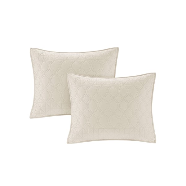 The Madison Park Linnette 3 Piece Reversible Coverlet Set offers a simple and elegant update to your bedroom. This cream quilted coverlet and matching shams feature two distinct quilting patterns that create an alluring textural look. A geometric design alternates with a circlet ogee pattern for added dimension and charm, while the prewashed fabric and cotton rich filling provide incredible softness and comfort. This coverlet also has an antimicrobial treatment that provides built-in freshness protection, reducing the growth of odor causing bacteria to keep fabric lasting longer.