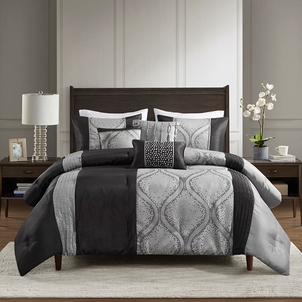 This traditional jacquard comforter set features an elegant ogee design pieced with solid stripes in a vertical layout for an opulent bedroom update. The three throw pillows featuring pintucks, woven jacquard, and embroidery help complete the set. Available in two options: stylish black with silver and grey or a lavish teal with silver and grey. The comforter and pillows are filled with hypoallergenic polyester filling that is dustproof, ensuring a restful and comfortable sleeping experience. This bedding set can also be machine washed and is extra durable for long lasting comfort.