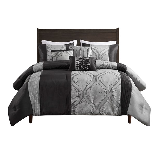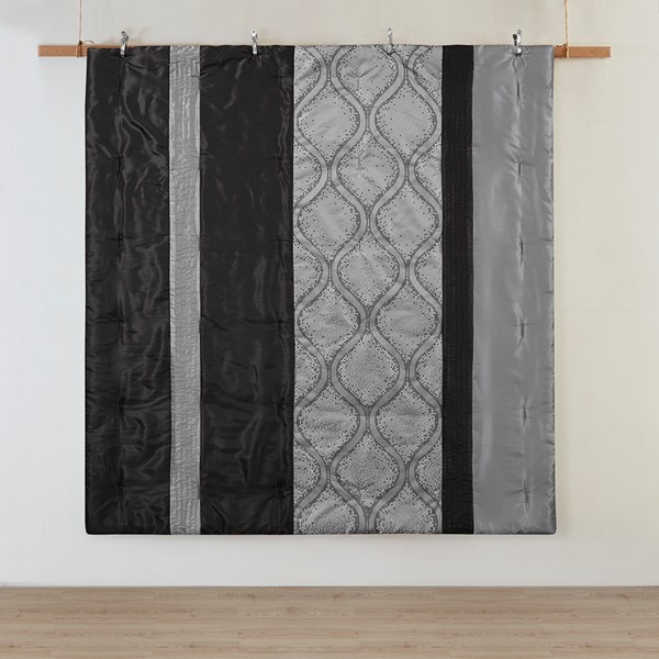This traditional jacquard comforter set features an elegant ogee design pieced with solid stripes in a vertical layout for an opulent bedroom update. The three throw pillows featuring pintucks, woven jacquard, and embroidery help complete the set. Available in two options: stylish black with silver and grey or a lavish teal with silver and grey. The comforter and pillows are filled with hypoallergenic polyester filling that is dustproof, ensuring a restful and comfortable sleeping experience. This bedding set can also be machine washed and is extra durable for long lasting comfort.