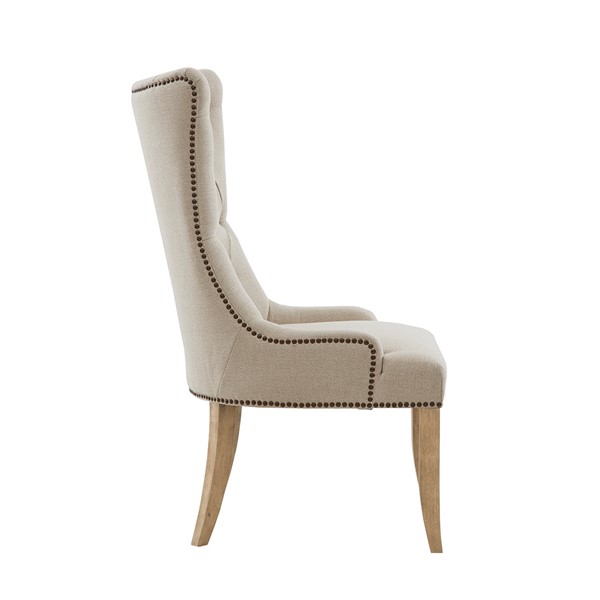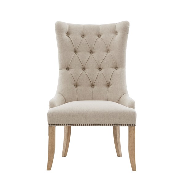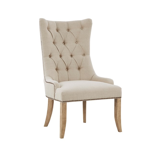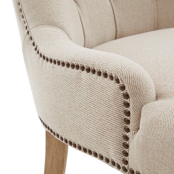 Add a stunning farmhouse update to your home decor Madison Park Lucas accent chair. This accent chair features a high, button-tufted back and antique bronze nailhead details that creates an elegant look. The natural fabric upholstery is complemented by the wheat finish on the solid wood legs to complete the farmhouse aesthetic. With its charm and sophistication, this accent chair elevates the style of your home decor.
