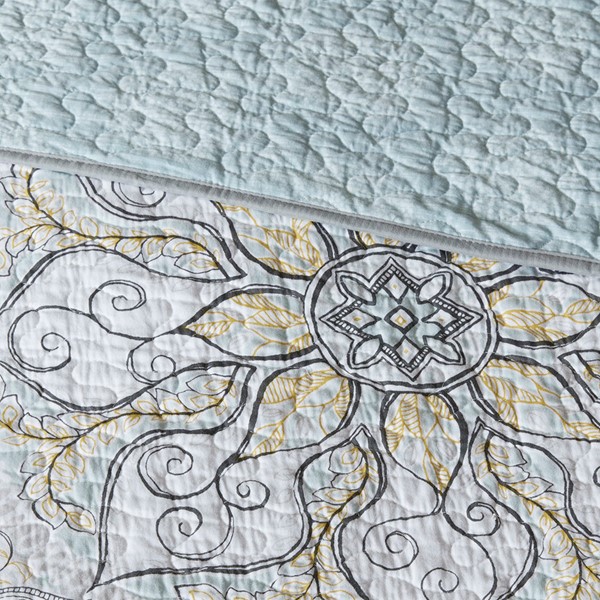 The Madison Park Lucinda 6 Piece Reversible Cotton Sateen Quilt Set easily refreshes your bedroom decor. Completely reversible, this quilted quilt features an over-scale printed medallion with delicate motifs in seafoam, white, and grey hues and a blue patterned reverse that creates a graceful look. Cotton rich filling within the quilt boasts exceptional softness and warmth to keep you comfortable. The matching shams mirror the reverse of the quilt for a beautiful coordinated ensemble, while three embroidered decorative pillows, in corresponding colors, add dimension and charm. With its globally inspired style, this cotton sateen quilt set displays an elegant sheen and is machine washable for easy care.