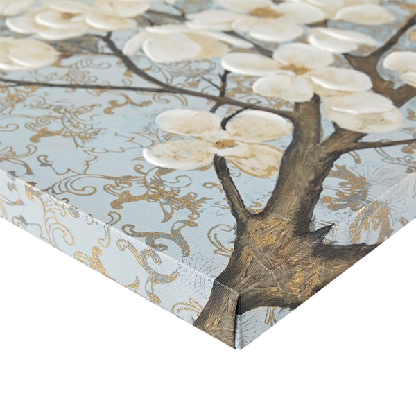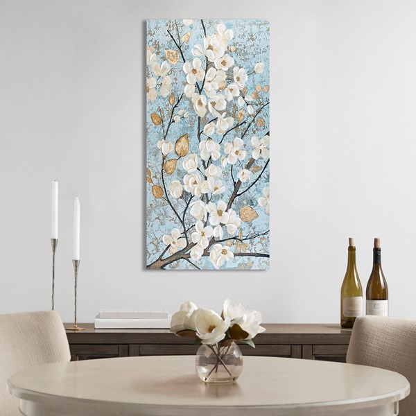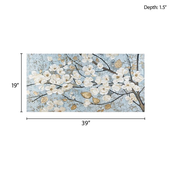 Add a quaint charm to your decor with the Madison Park Luminous Bloom Gold Foil and Hand Embellished Floral Canvas Wall Art by Artist Matina Theodosiou. This canvas features a beautiful white floral design on a soft blue and grey base, while the gold foil accents provide a light sheen for a transitional floral update. Brushstroke hand embellishment adds rich texture and dimension, while 4 D-rings on the reverse gives this piece versatility to be hung both vertically or horizontally fitting to any space. Perfect for any room in your home, this floral farmhouse canvas art measures 39×19" and brings a charming touch to your space. Spot clean only.