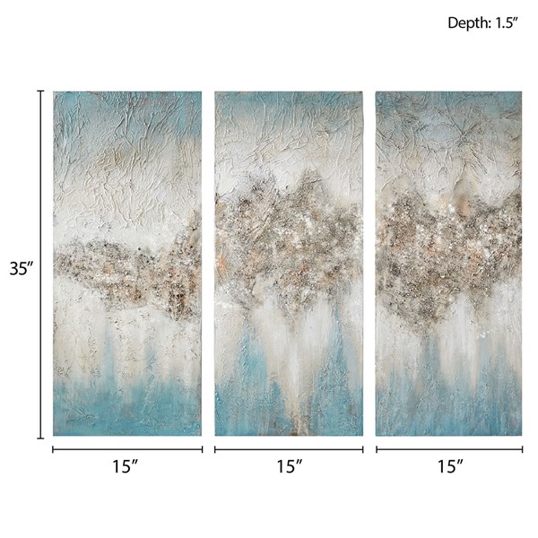 Accent your space with the contemporary allure of our Madison Park Luminous Heavily Embellished 3-piece Canvas Wall Art Set. 100% hand-painted, this canvas wall art set showcases rich neutral and blue ascending shades to create a cool ombre abstract look. Natural rock and stone embellishment on each canvas create beautiful texture and dimension, while a glitter finish adds a rich sheen and luster. Each piece measures 15×35" and also features 2 D-rings on reverse making it easy to hang, while an MDF backing provides additional support and structure. Hang this three piece hand-painted canvas set in your living room, dining room, or entry way to bring a chic modern sparkle to any space. Due to hand embellishment of natural rock and stone; colors and glitz may vary slightly from image making each piece unique.