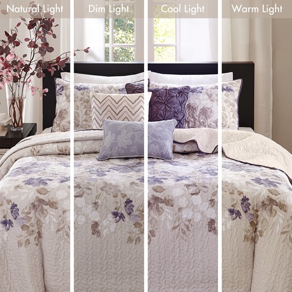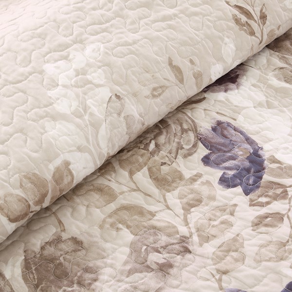 Create a calming oasis with the Madison Park Luna 6 Piece Reversible Quilt Set. This beautiful collection features a watercolor floral print across the center of the quilt that dissipates to solid ivory on the top and bottom. Three decorative pillows play up the soft purple and taupes to pull this collection together.