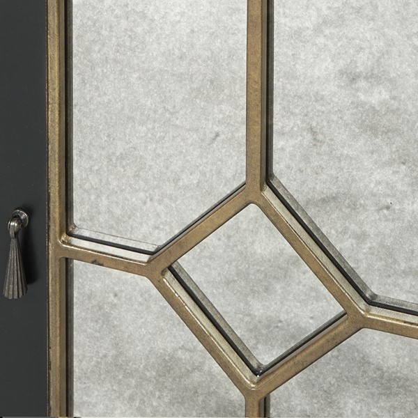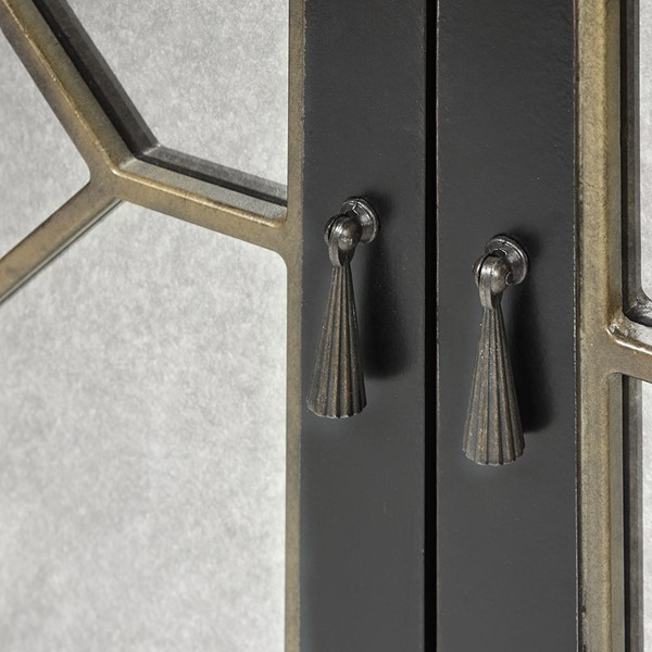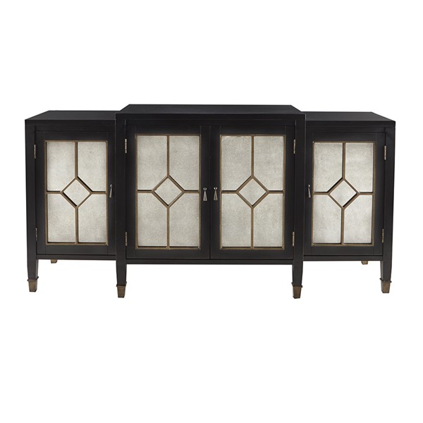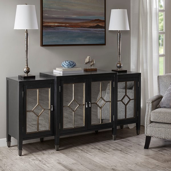 Sharp and elegant, the Madison Park Lyle Buffet makes a functional and stylish addition to your dining room. The manufactured wood frame and solid wood legs feature a distressed black finish with a gold trim, for a refined look. Each door showcases a mirrored front adding a luxurious touch, while a magnetic catch keeps the doors securely closed. Inside the buffet, an adjustable shelf allows you to easily store your flatware and glasses. Place this stunning buffet in your kitchen to add a beautiful transitional look to your decor. Assembly is required.