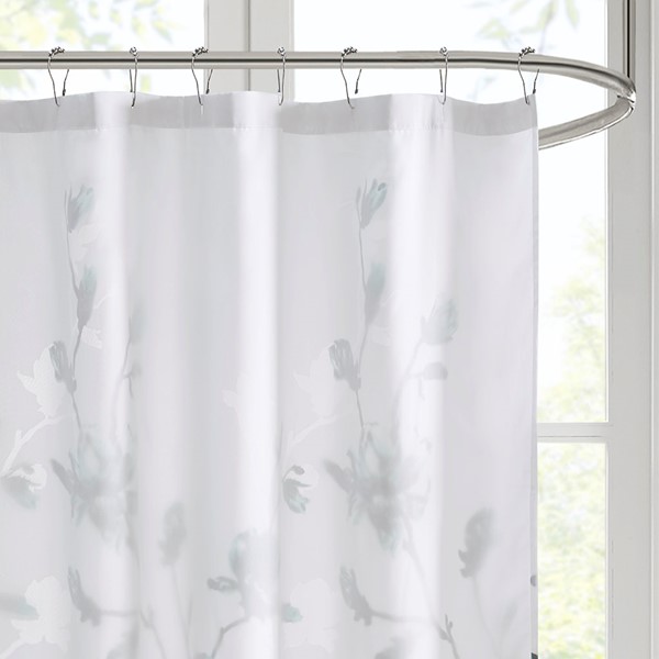 Add a soft touch of beauty to your bathroom with our Madison Park Magnolia Floral Printed Burnout Shower Curtain. This light weight shower curtain features a beautiful floral printed burnout design in soft aqua and grey hues, for a fresh and modern duet. An added microfiber liner provides better privacy and drapability; while still machine washable for easy care. Measuring 72″x72″, this floral shower curtain is the perfect addition for a lively, feminine touch.