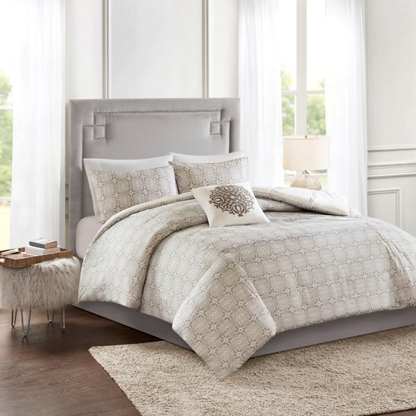 Style your bedroom with the shabby chic allure of the Madison Park Malia 4 Piece Embroidered Cotton Reversible Duvet Cover Set. The face of the reversible duvet cover features tufted grey embroidery on an ivory base, while the reverse showcases an all-over grey medallion print that complements the top of the bed. Two matching shams mirror the face of the cotton duvet cover and an embroidered medallion design on the square decorative pillow provides an elegant finishing touch to the cotton duvet cover set. Machine washable for easy care, this reversible duvet cover set is made from 100% cotton and provides a comfortable shabby chic update to your bedroom decor. Button closures help secure a comforter insert within the duvet cover and four inside ties in the corners help prevent it from shifting (insert is NOT included). Items in the set may come in a rolled or compressed packaging, which will need to be fluffed up or steam ironed before use to remove wrinkles.