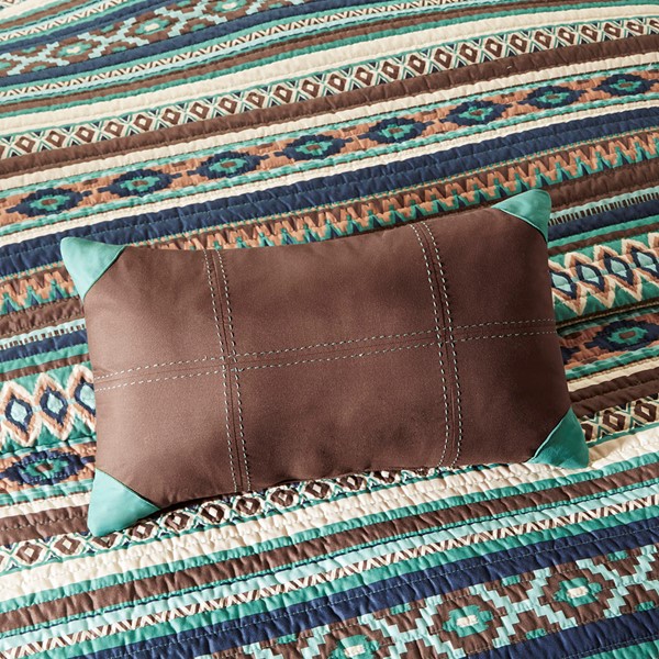 For a more casual feel to your room, the Madison Park Malone 6 Piece Reversible Quilt Set Collection is sure to make you feel right at home. This southwestern inspired design features rich blues, chocolate and ivory tones playing off each other creating the perfect color scheme. Three decorative pillows in this set feature piecing and embroidery details pulling this whole look together. Items in the set may come in a rolled or compressed packaging, which will need to be fluffed up or steam ironed before use to remove wrinkles.