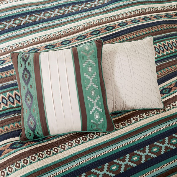 For a more casual feel to your room, the Madison Park Malone 6 Piece Reversible Quilt Set Collection is sure to make you feel right at home. This southwestern inspired design features rich blues, chocolate and ivory tones playing off each other creating the perfect color scheme. Three decorative pillows in this set feature piecing and embroidery details pulling this whole look together. Items in the set may come in a rolled or compressed packaging, which will need to be fluffed up or steam ironed before use to remove wrinkles.