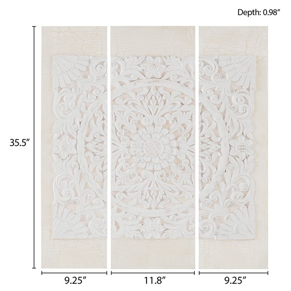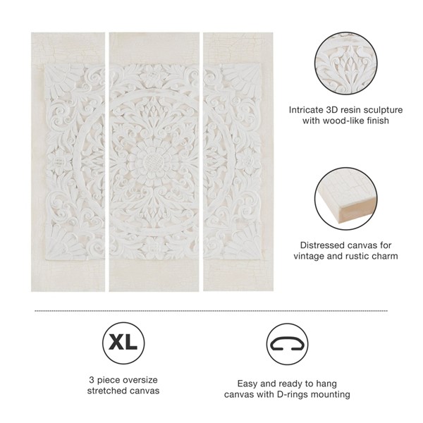 Hang our Madison Park Mandala Triptych 3-piece Dimensional Resin Canvas Wall Art Set on your wall to create a unique focal point in your space. An intricate carving design with the look and feel of wood is made from durable resin, then attached to the embellished canvas and set among each piece of this 3PC wall decor. The embellished canvas is featured in an off white washed tone and purposefully distressed, adding a rustic charm to the look. Globally inspired, this alternative wall decor adds a stunning texture and unique boho touch to any room in your home.