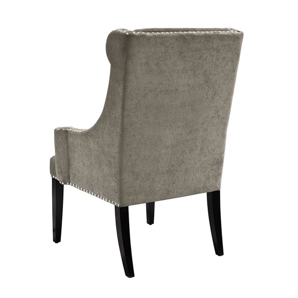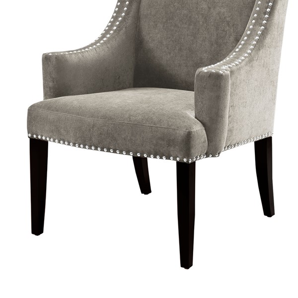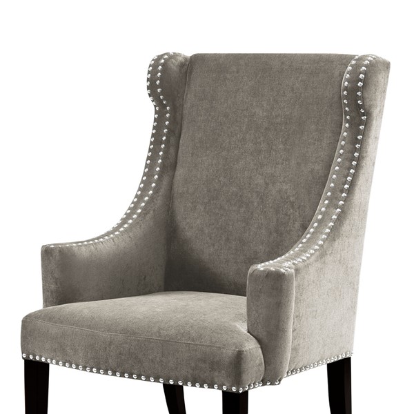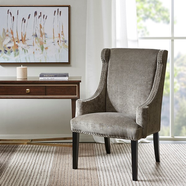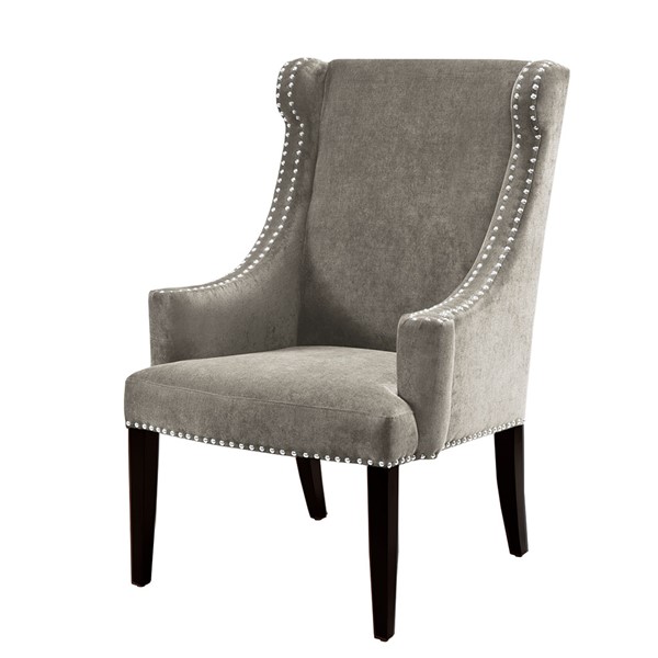 Add this stylish piece to your decorating mix as an updated accent wing chair with curved arms and double row nail head trim. Leg assembly required.